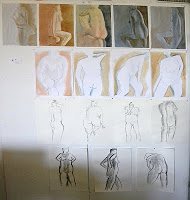 Vecka 2 var det Modell med akvarell. Om det blev få bilder första veckan blev det dessto fler denna vecka. Tar därför ett foto på min väggdel den dag vi visade vad vi gjort under veckan. Material är akvarell med krita, kol och tusch. Ursäkta skuggorna men lokalen hade mycket möbler och många fönster.