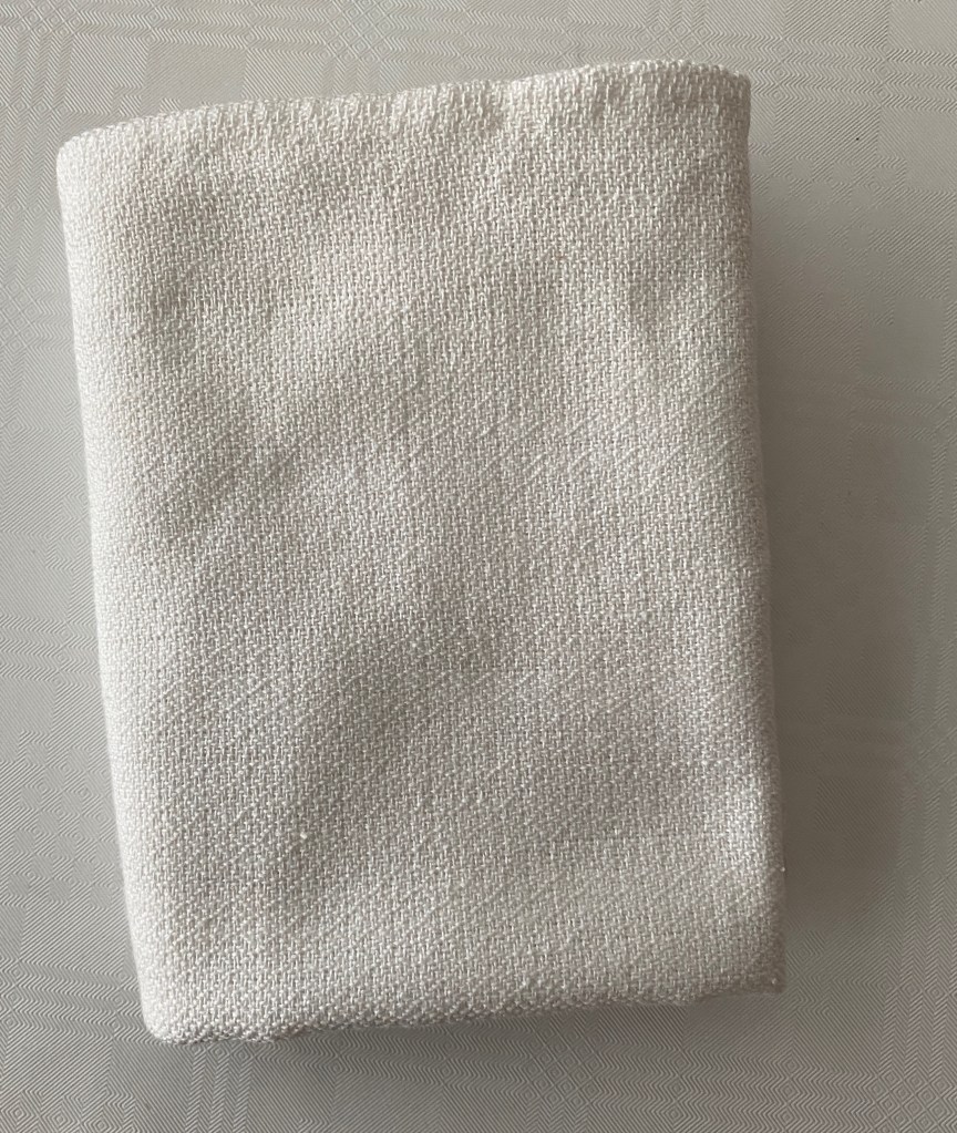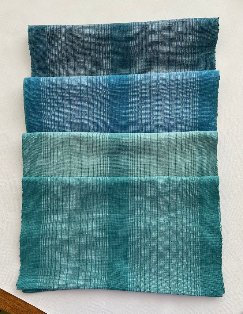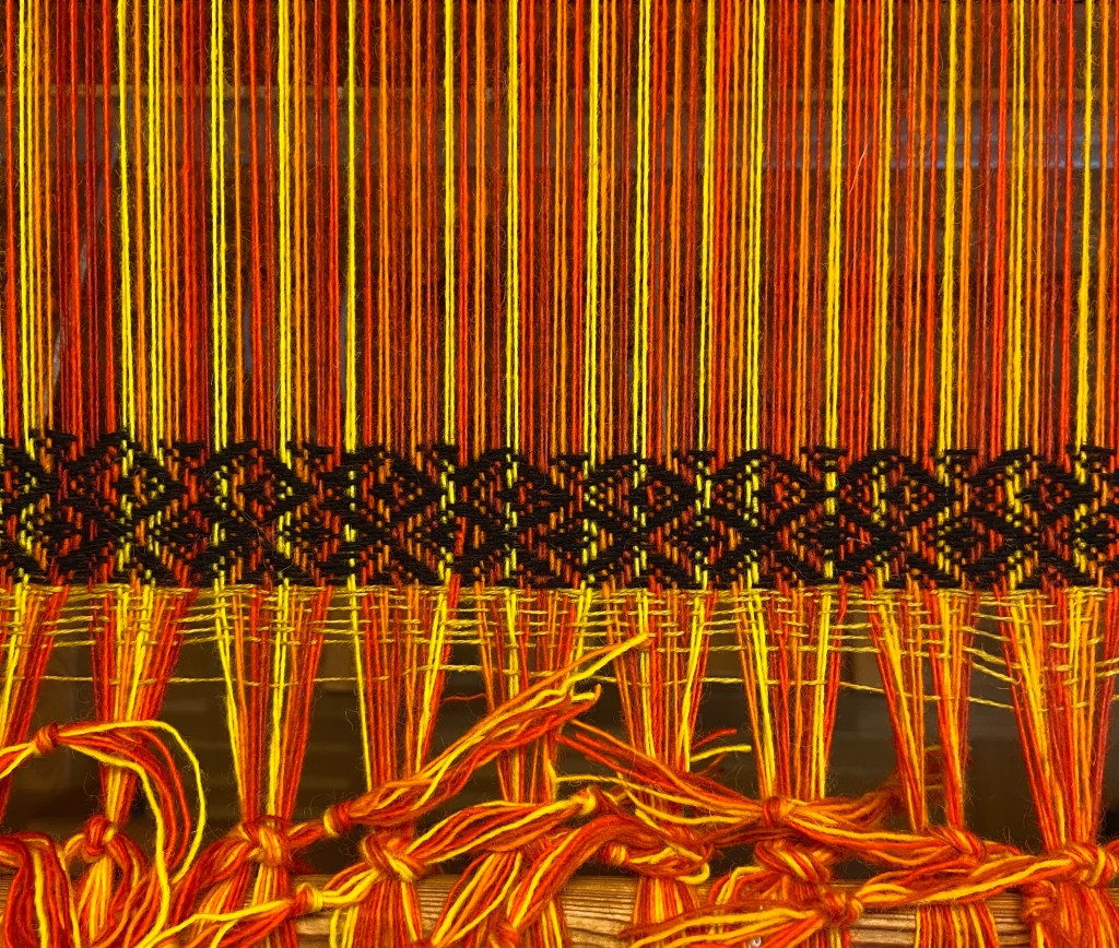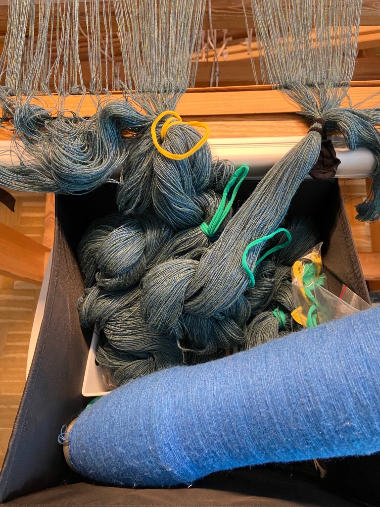 Första gången med 8 skaft. Stash weaving – med det som fanns hemma och randigt anpassat till mönstret.